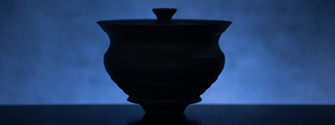まるで映画のワンシーンに使われるようなモダンな作品。陶芸家:田中元将さんの黒鳴壺。