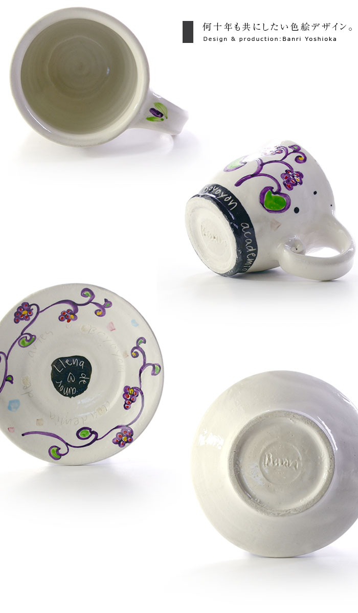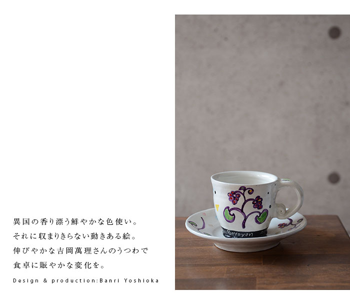 注目の作家「吉岡萬理」さんのアート溢れる和食器・色絵コーヒーカップ。