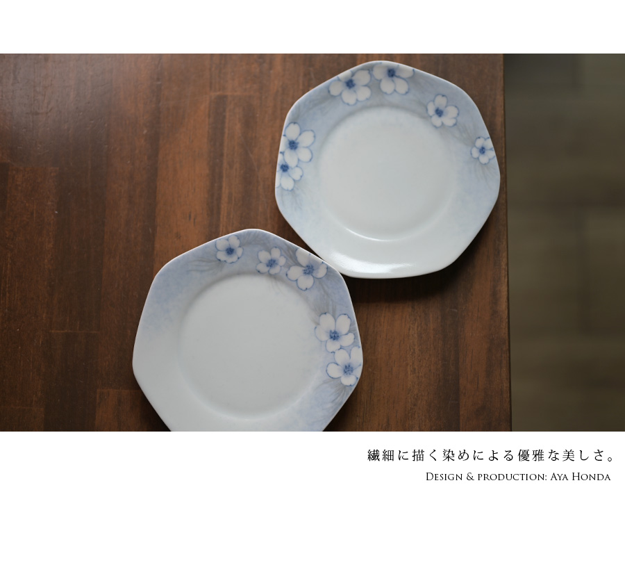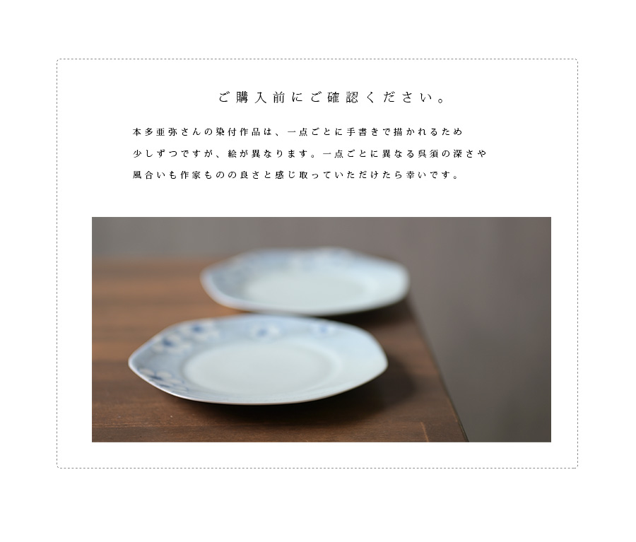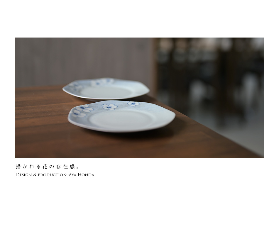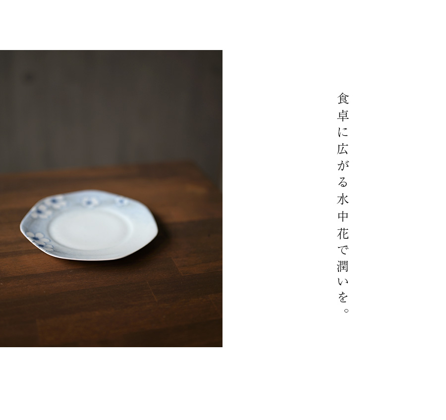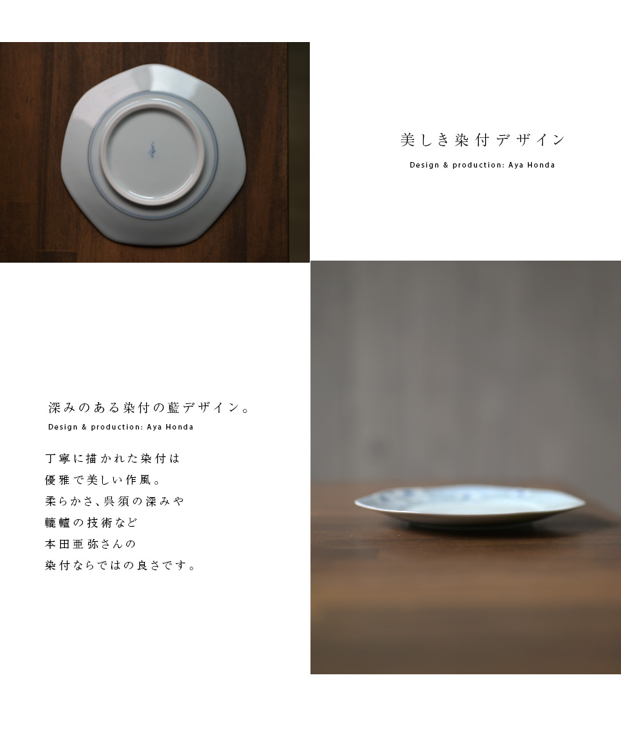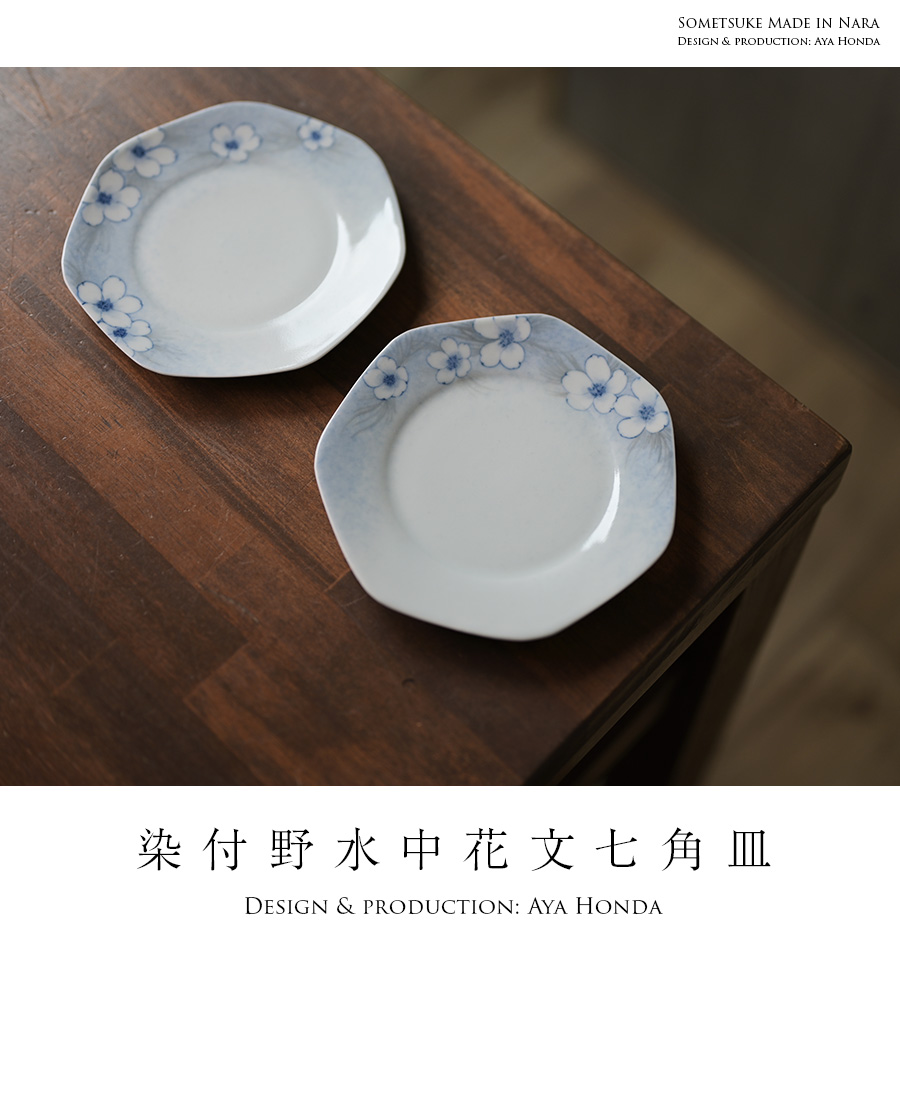 奈良県・天理で作陶する本多亜弥さんの染付水中花文七角皿 。