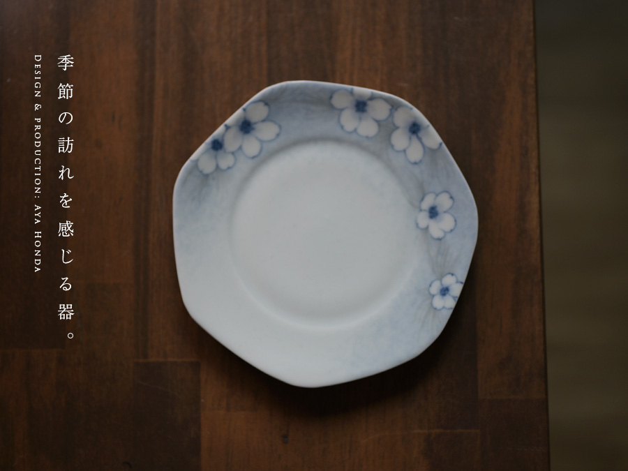 まるで食卓に水中花が漂いそうなおしゃれな七角皿(15cm)。