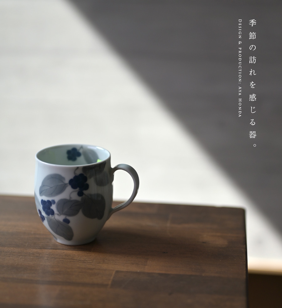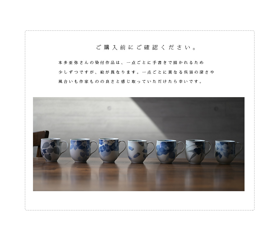 7つの植物から選べる陶芸家・本多亜弥さんの染付マグカップ 。
