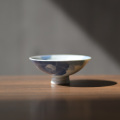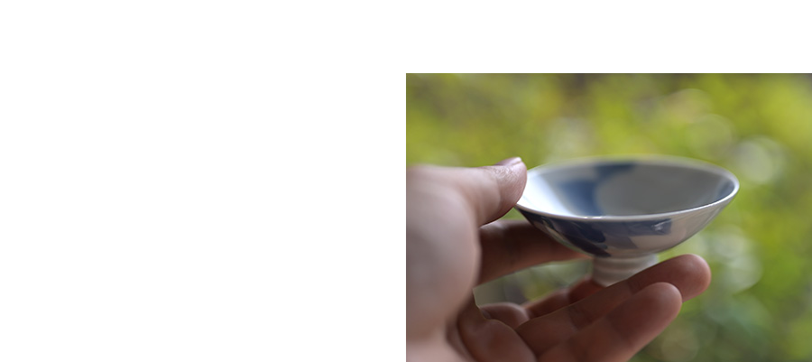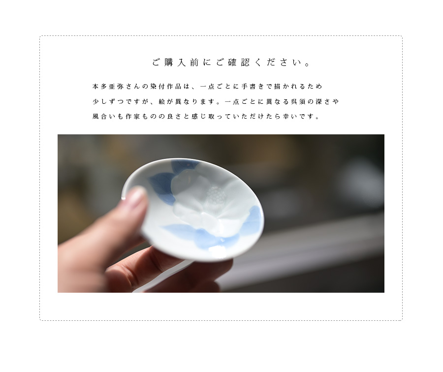陶芸家・本多亜弥さんの盃に椿を彫り、呉須で描くモダンな染付作品。