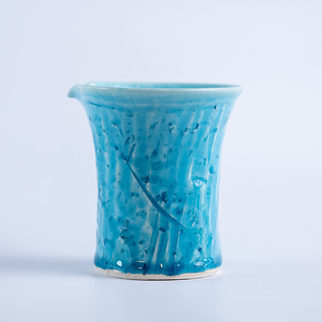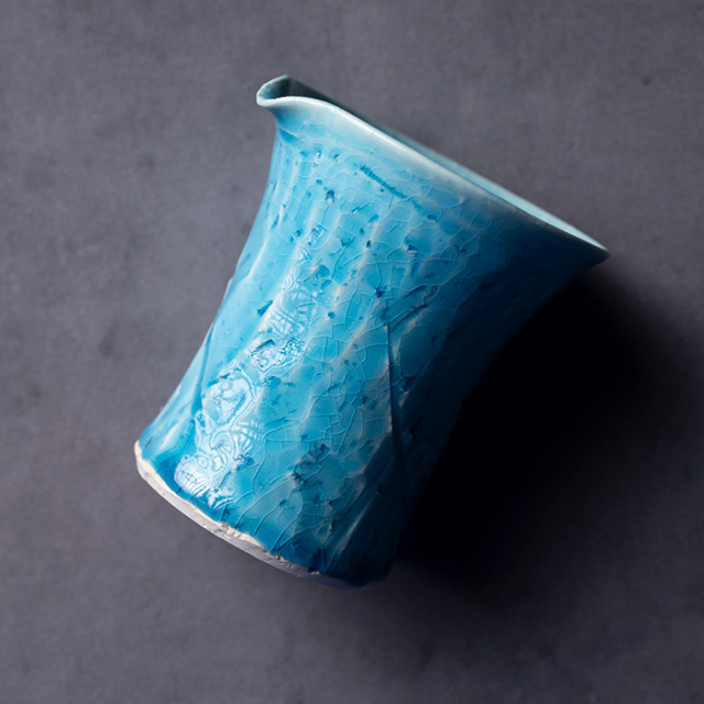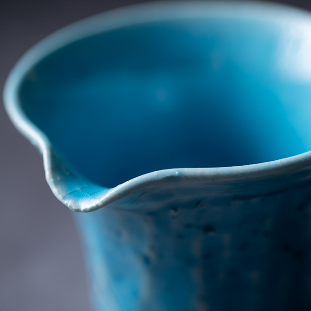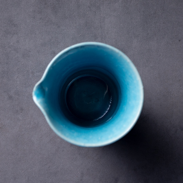 京都で制作する荒木漢一さんの酒器:トルコブルー片口。