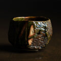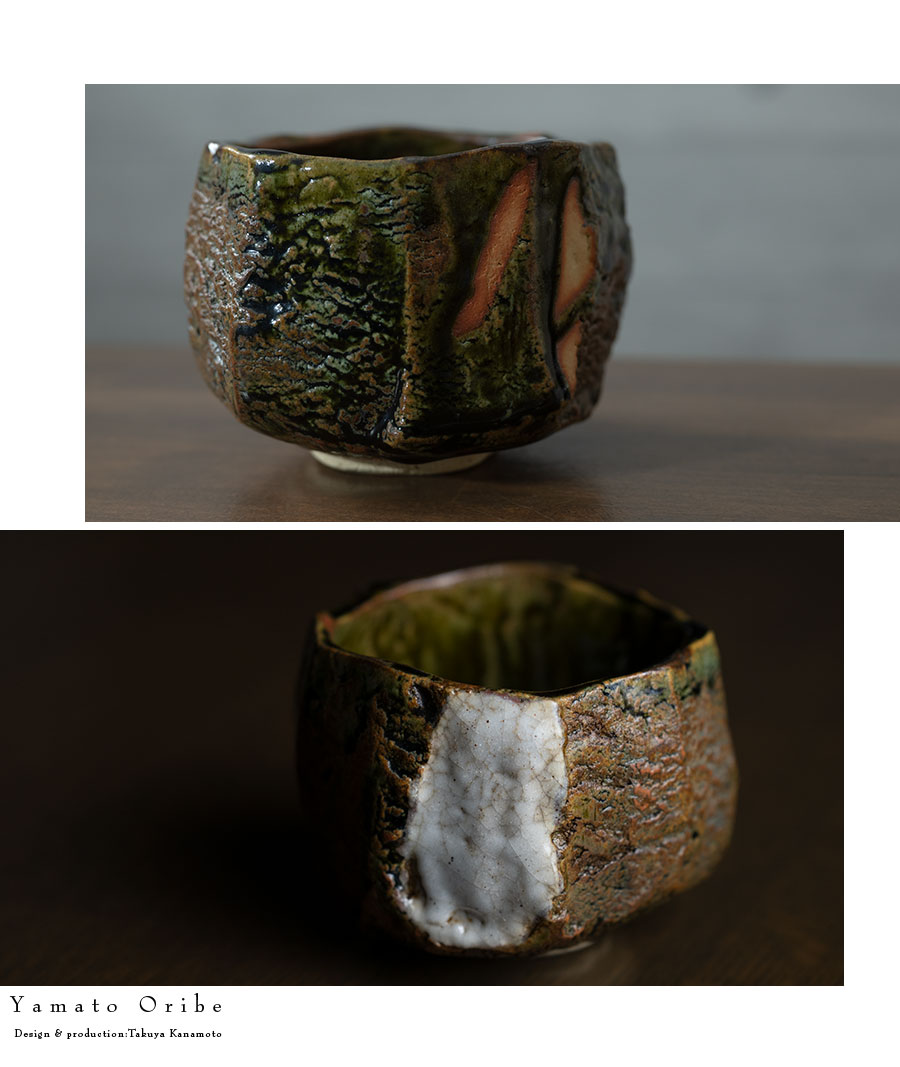 土の動きが見られる個性あふれる織部茶碗デザイン。