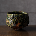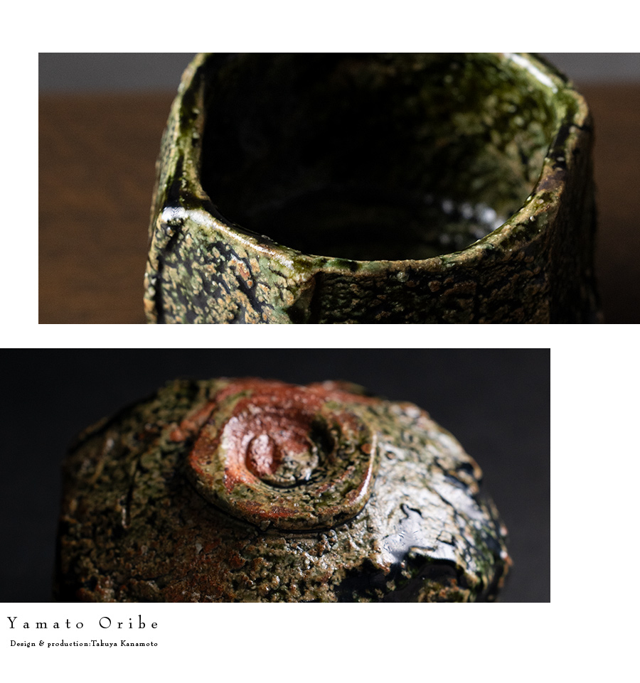 土の動きが見られる個性あふれる織部茶碗デザイン。