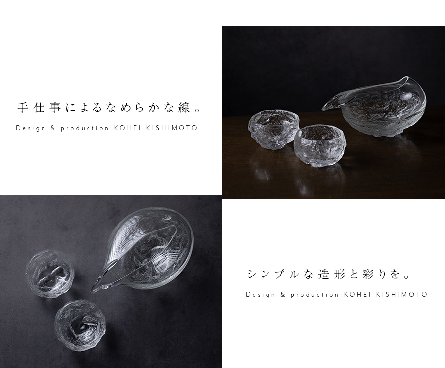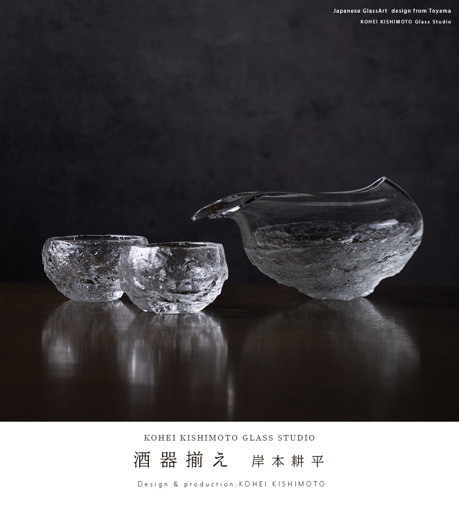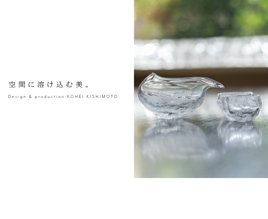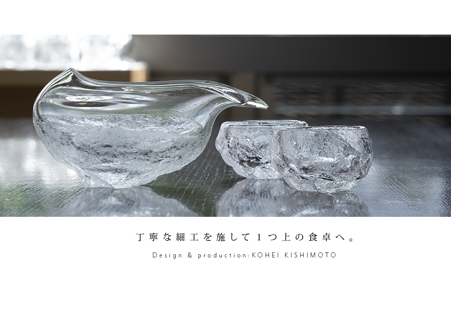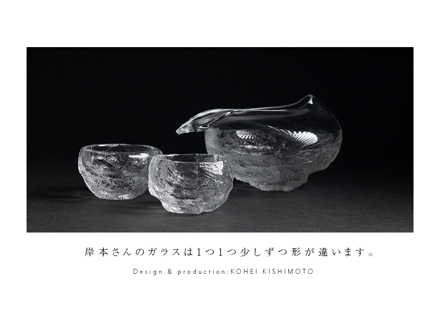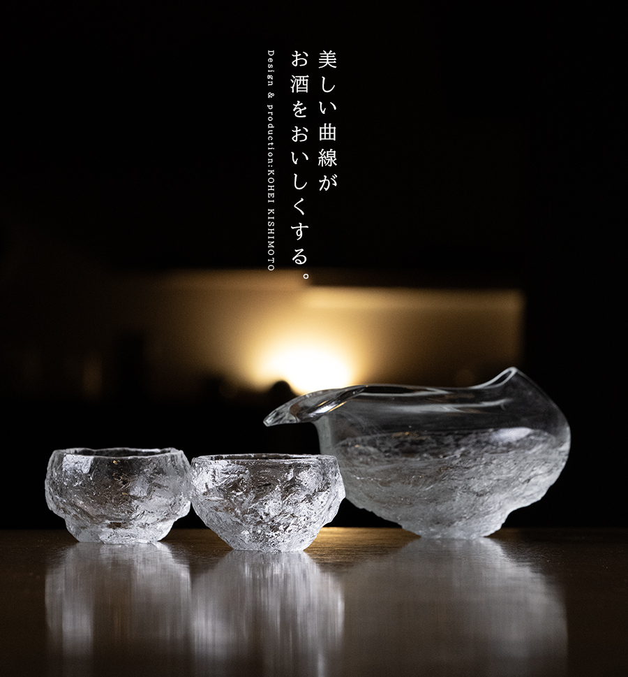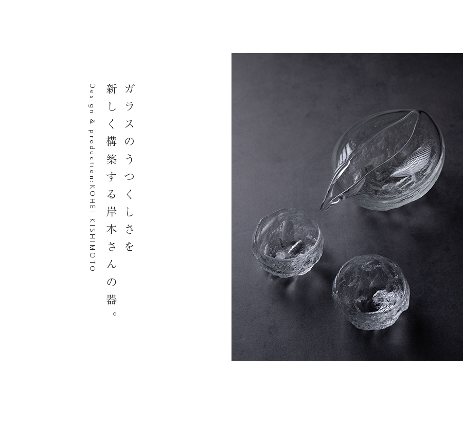 空間に美しい表情を与えるガラス作家:岸本耕平さんのガラス酒器揃え。
