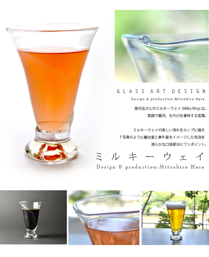 ご投稿ありがとうございます。 『ガラス ミルキーウェイ』は天の川をイメージした作品で、 気泡で表現した数々の星たち。縁にはワンポイントの一つ星がついています。 少し気を使っていただいてメルヘンの世界をお楽しみください。